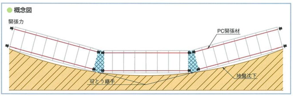 緊張材によって一体化された函体群を可とう継手によって接続し、可とう継手の変形性能により地盤の変形に追随させる構造である。