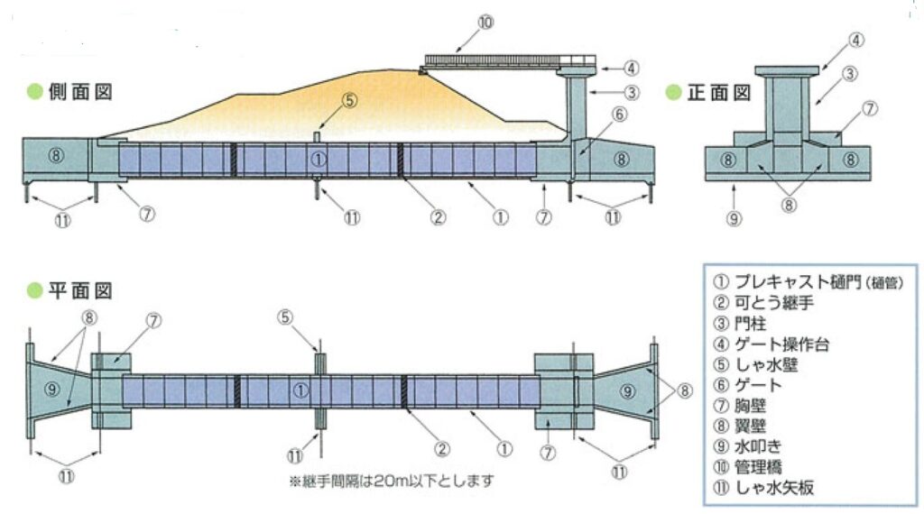 - 製品長1 m~2m程度を連結して樋門を構築するため、現場打ち樋門に比べて、地盤変形に追随しやすく、樋門の安定を図ることができる。